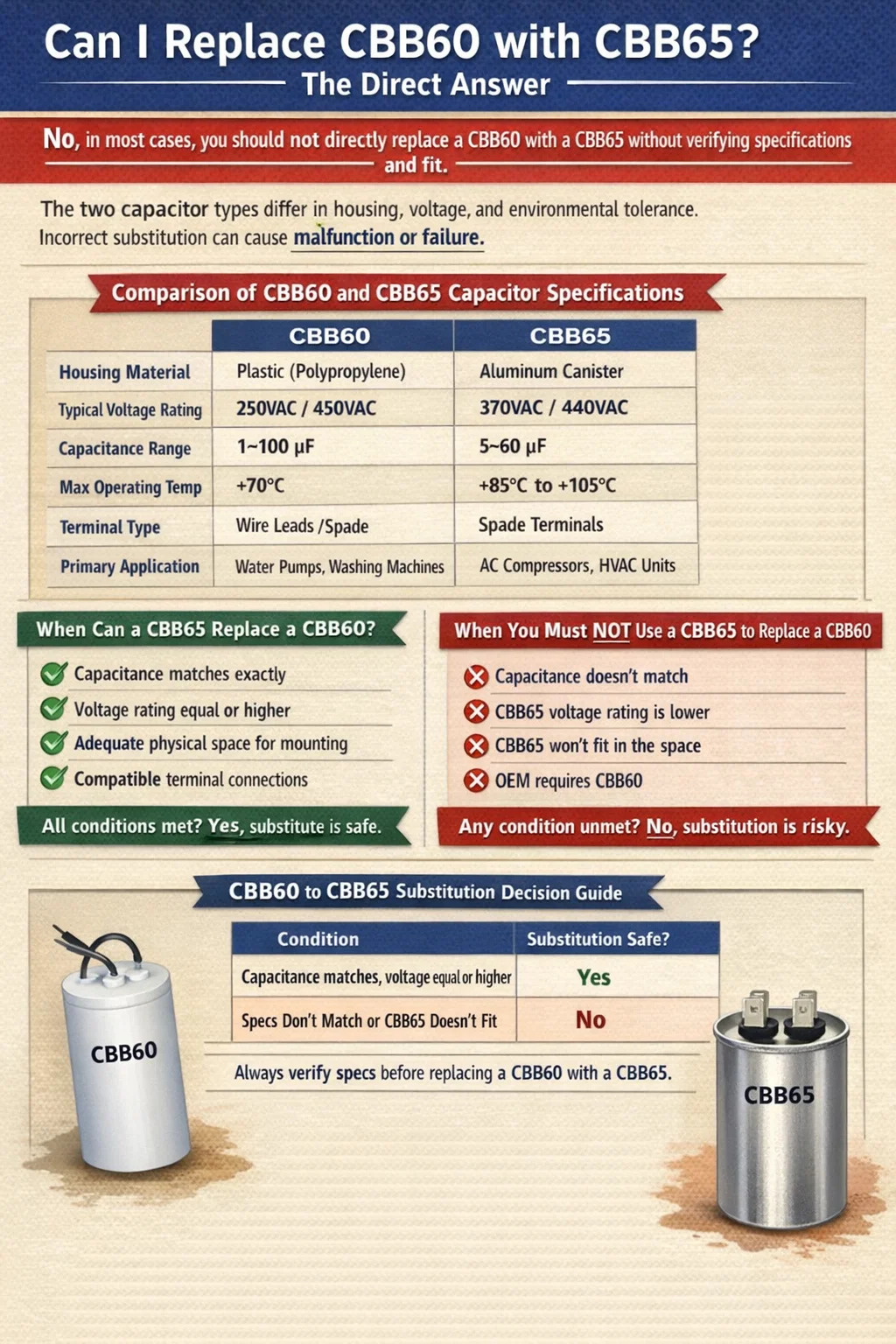 Is é an freagra gairid: i bhformhór na gcásanna, ní hea - níor cheart duit athsholáthar díreach a dhéanamh ar a CBB60 toilleoir le CBB65 gan sonraíochtaí d’iarratais a fhíorú go cúramach. Cé gur toilleoirí mótair AC iad araon a bhfuil an bhunfheidhm chéanna acu maidir le héifeachtúlacht mótair agus fachtóir cumhachta a fheabhsú, tá difríocht mhór acu i dtógáil fisiceach, dearadh tithíochta, rátálacha voltais, agus timpeallachtaí suiteála beartaithe. D'fhéadfadh mífheidhmiú trealaimh, teip toilleora roimh am, nó fiú guais sábháilteachta a bheith mar thoradh ar mhalartú ceann amháin ar an gceann eile gan na difríochtaí seo a thuiscint.
