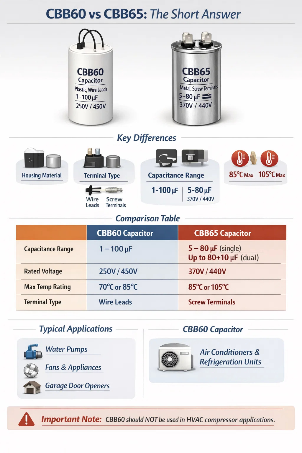 Tá aird ar leith tuillte ag na rátálacha voltais. Tá an CBB65 ar fáil beagnach go heisiach i 370 VAC agus 440 VAC chun na coinníollacha voltais a láimhseáil taobh istigh de chórais comhbhrúiteora HVAC, nuair is féidir le borradh nóiméadach le linn tosaithe mótair a bheith i bhfad níos airde ná an voltas líne ainmniúil. Bheadh toilleoirí CBB60 ag 250 VAC tearcrátaithe go contúirteach sna coinníollacha sin—fiú dá mba rud é go raibh an luach toilleas ag teacht leis.