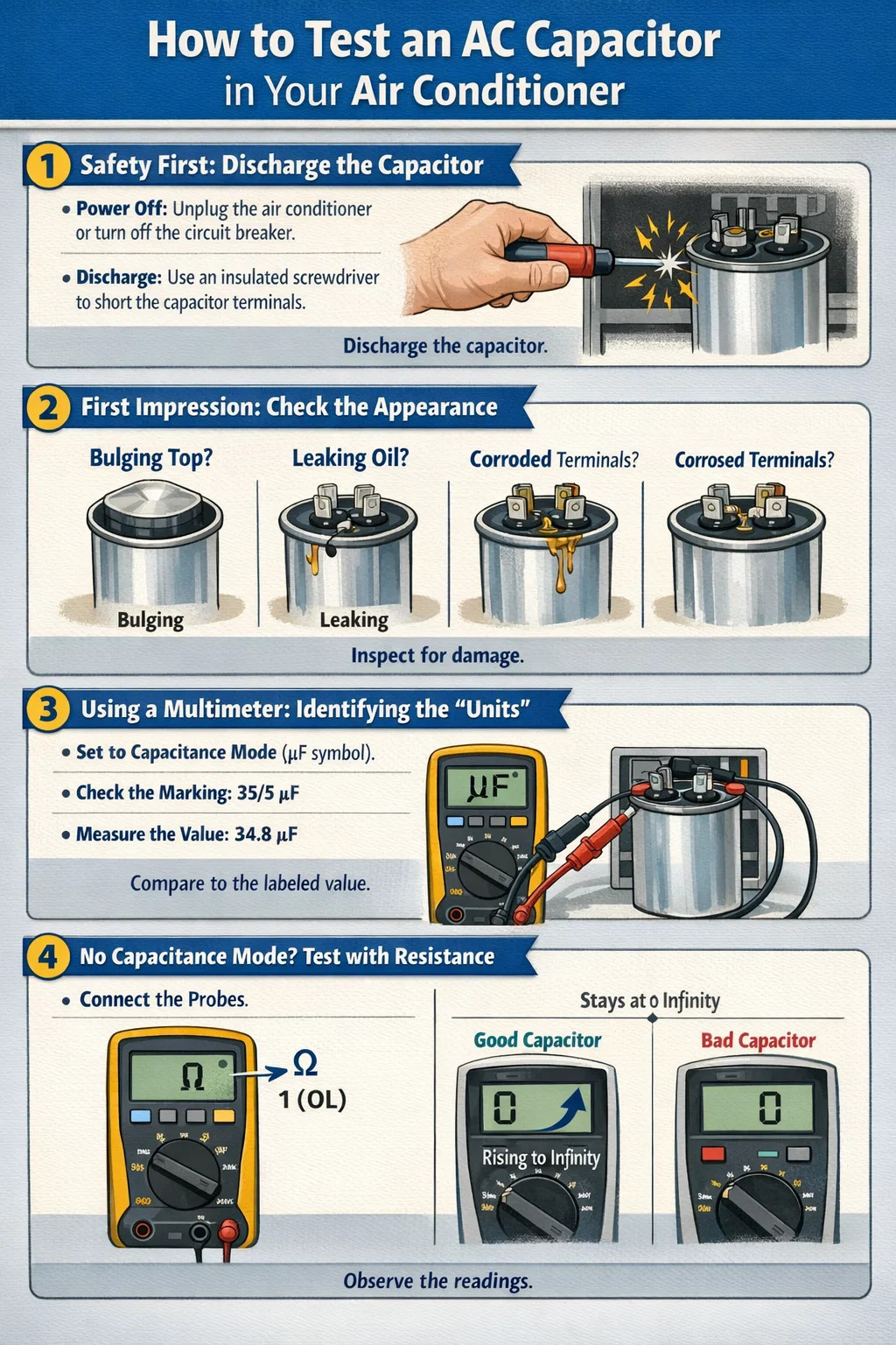 Chun a chinneadh an bhfuil toilleoir AC in oiriúntóir aer maith nó olc, ní gá eolas gairmiúil innealtóireachta leictreonaice. Chomh fada agus a bhfuil multimeter agat le feidhm "tástáil toilleas", is féidir leat na céimeanna seo a leanúint agus a bheith i do leath-shaineolaí tú féin.