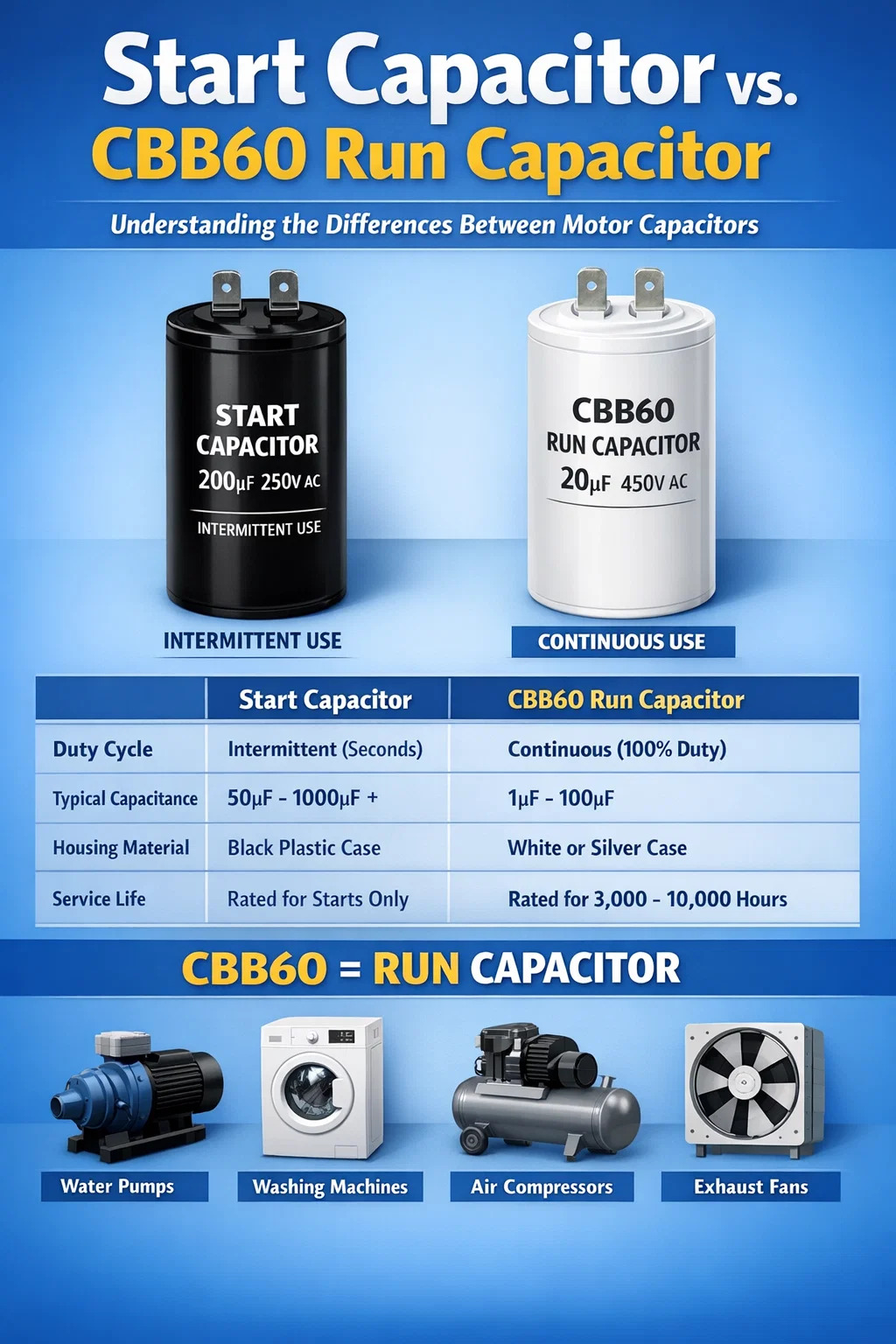 Difríochtaí Feidhme: Toilleoir Tosaigh vs CBB60 Run Capacitor