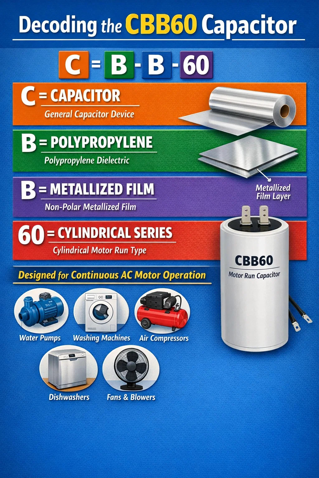 Ar chomhpháirt leictreach, an téarma CBB60 Is cód caighdeánach tionsclaíoch na Síne (GB) é a shainaithníonn ábhar tréleictreach sonrach agus catagóir feidhme an toilleora. I mBéarla simplí, is ionann CBB60 agus a scannán polapróipiléine miotailithe toilleoir rith mótair múnlaithe i dtithíocht sorcóireach. Tá an comhpháirt seo deartha go sonrach chun fanacht i gciorcad AC go leanúnach agus mótar ag rith, ag soláthar an t-athrú céime is gá chun chasmhóiminte mótair agus éifeachtacht a chothabháil.