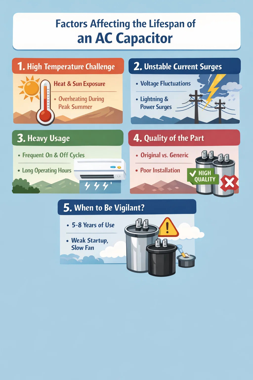 Luaineachtaí voltais: Má tá an voltas timpeall do theach éagobhsaí, ag luaineacht go minic, caithfidh an toilleoir AC muirearú agus urscaoileadh arís agus arís eile chun an sruth a chothromú. Cuireann an "obair struis" seo go minic dlús le dul in aois a chuid ábhar inmheánach.